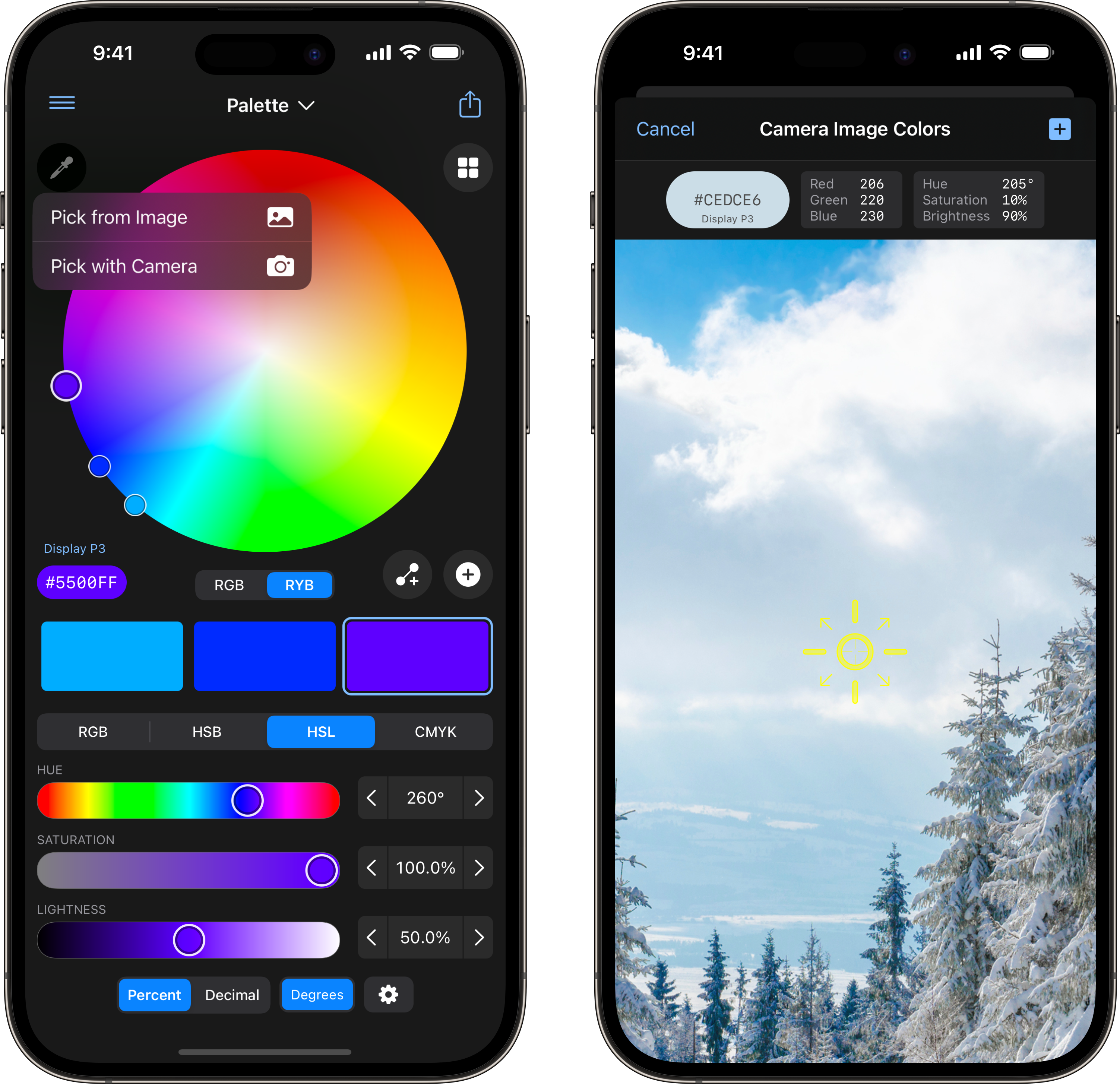 Added live camera view color picker. Tap the eyedropper button to choose between Image and Camera color pickers. (Pro)