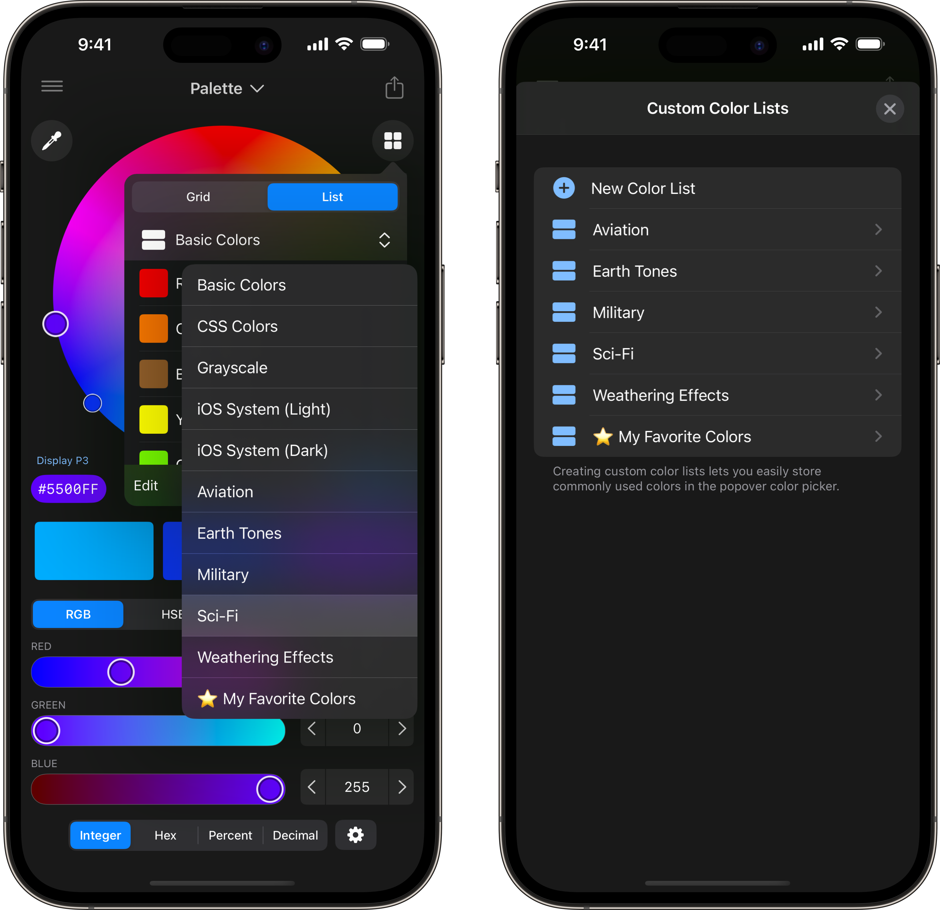 Long-tapping a palette color now offers an action to add the color to a custom color list (Pro)