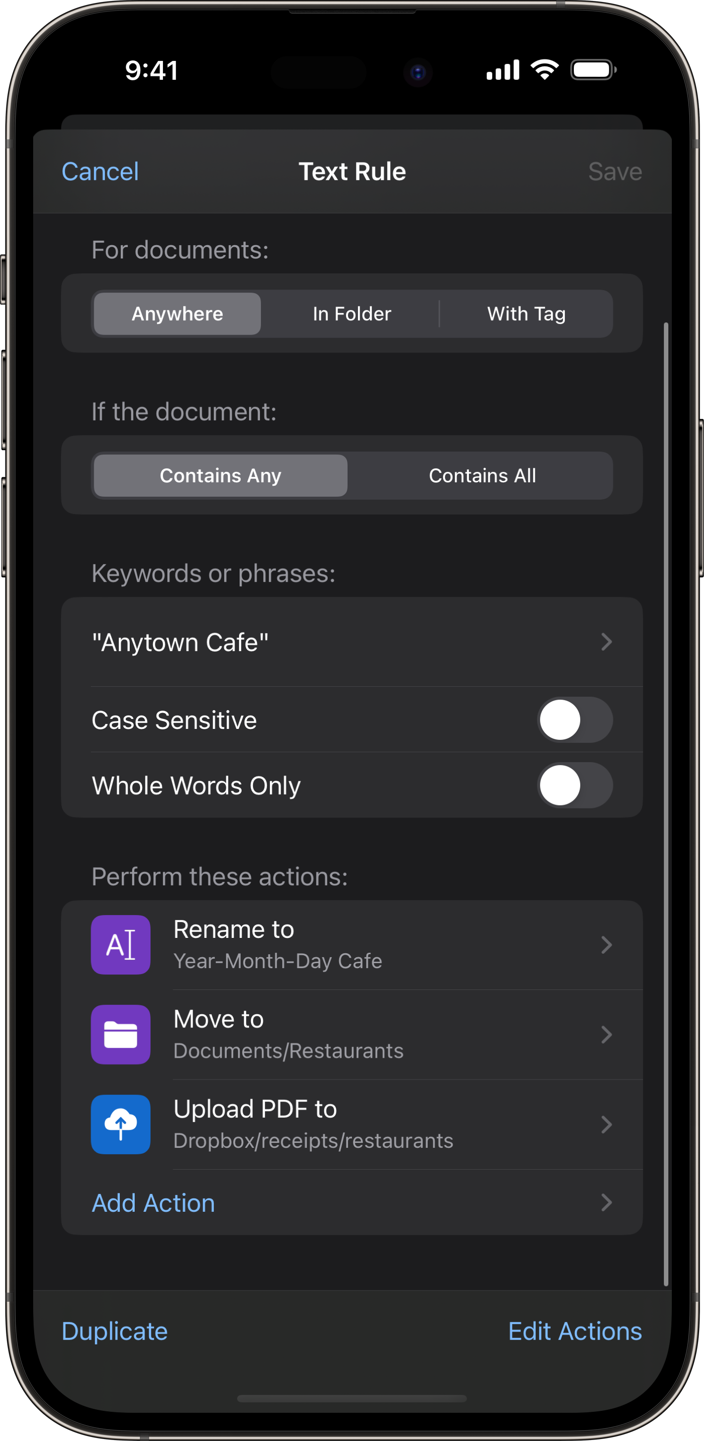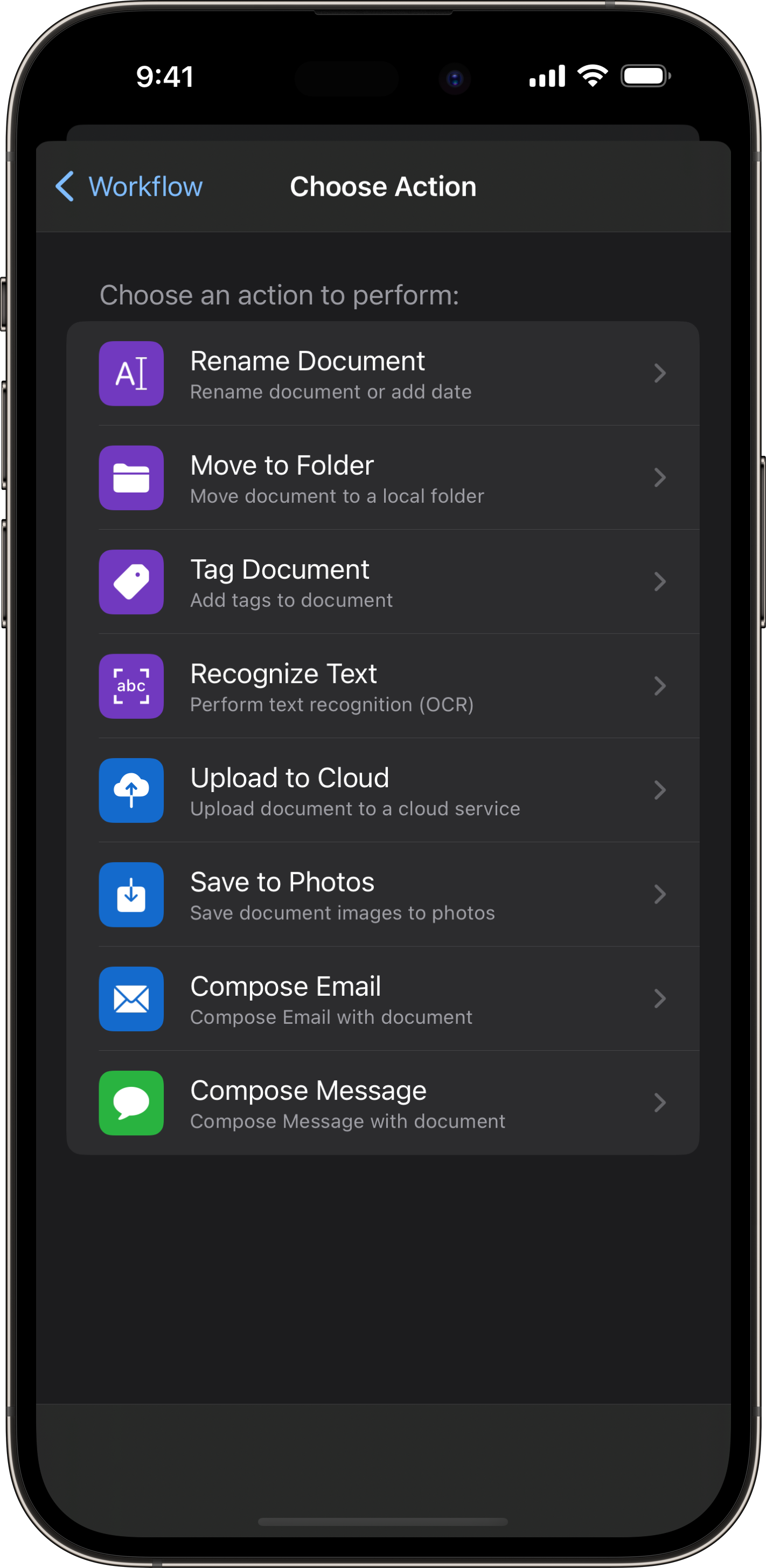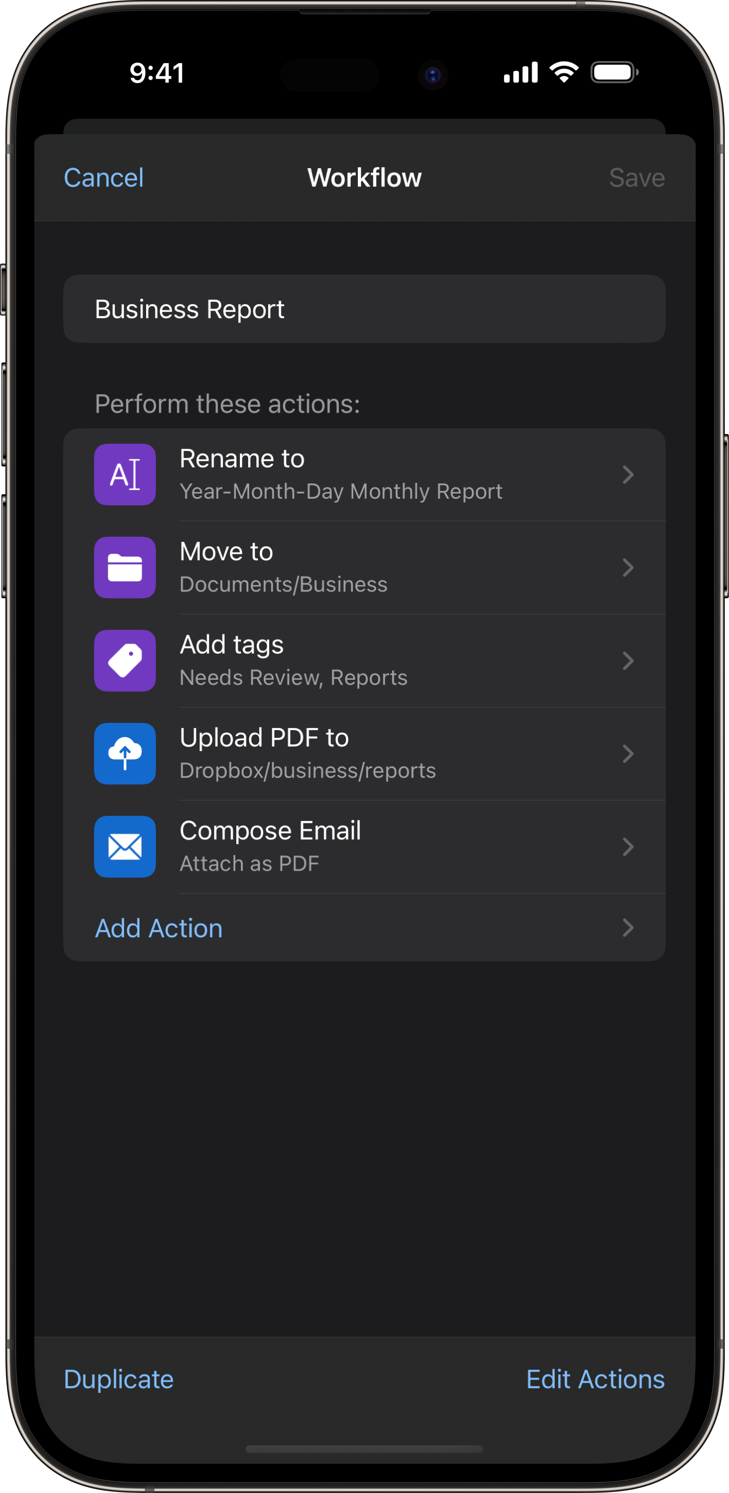 Create your own workflows to automate a series of actions, such as renaming, moving, or uploading documents.