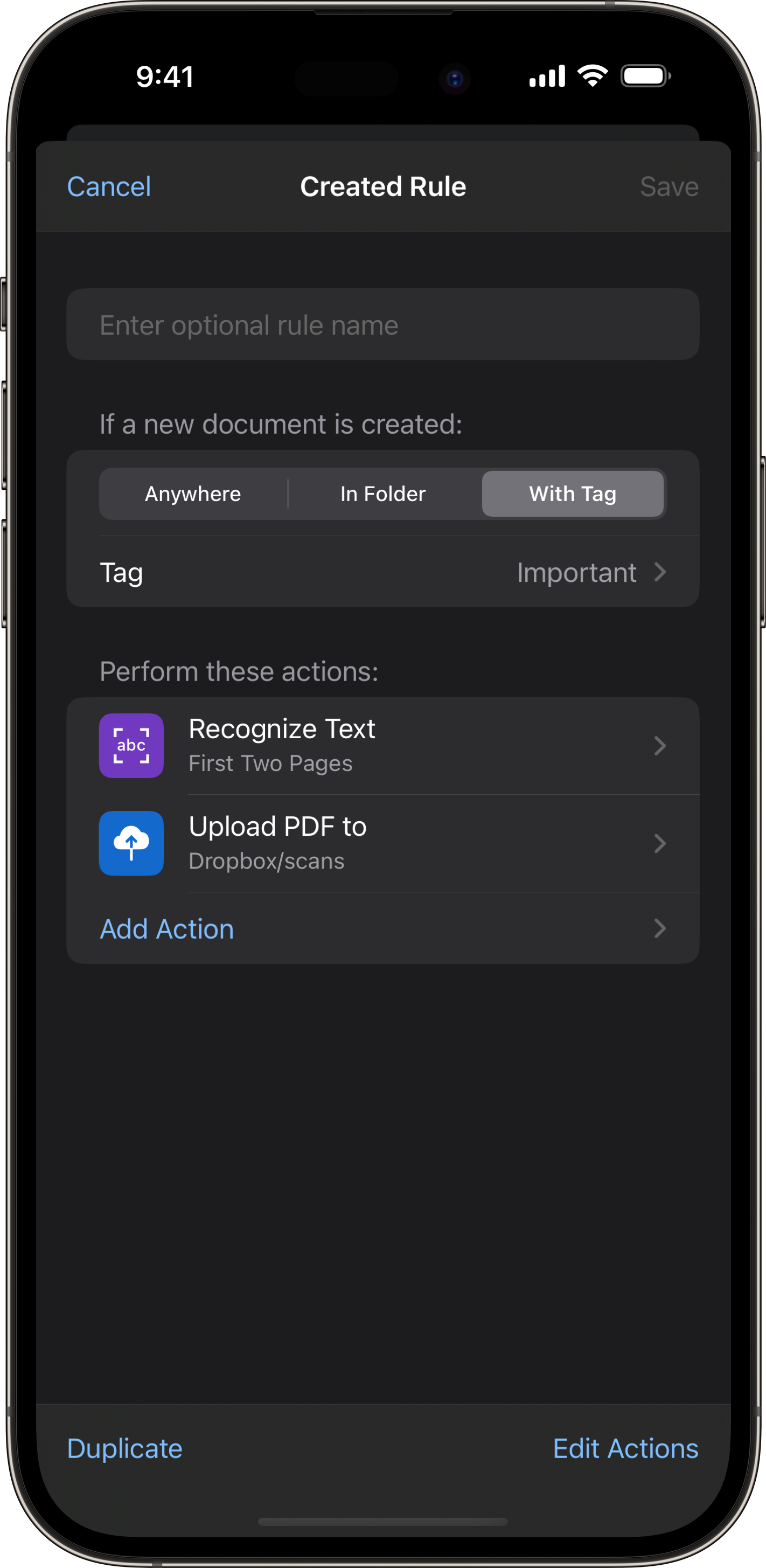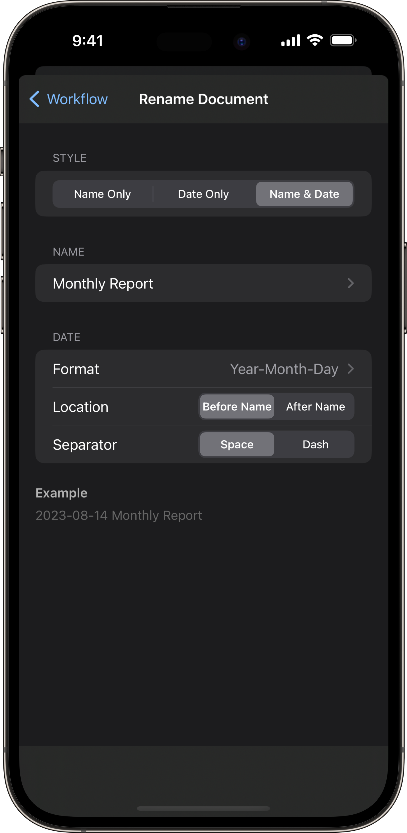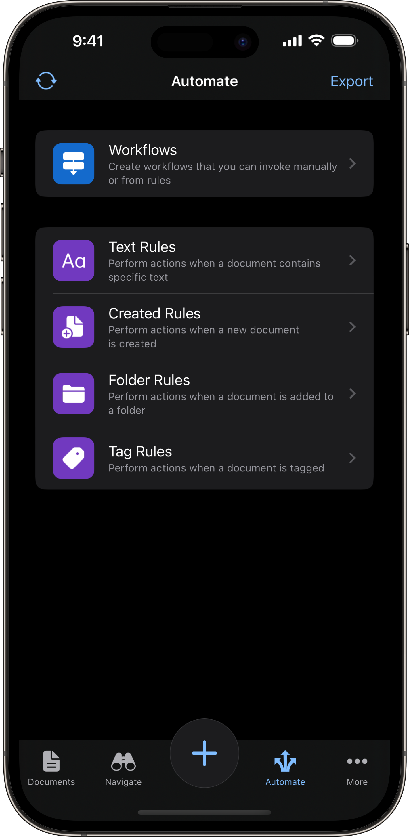 Create your own workflows to automate a series of actions, such as renaming, moving, or uploading documents.
