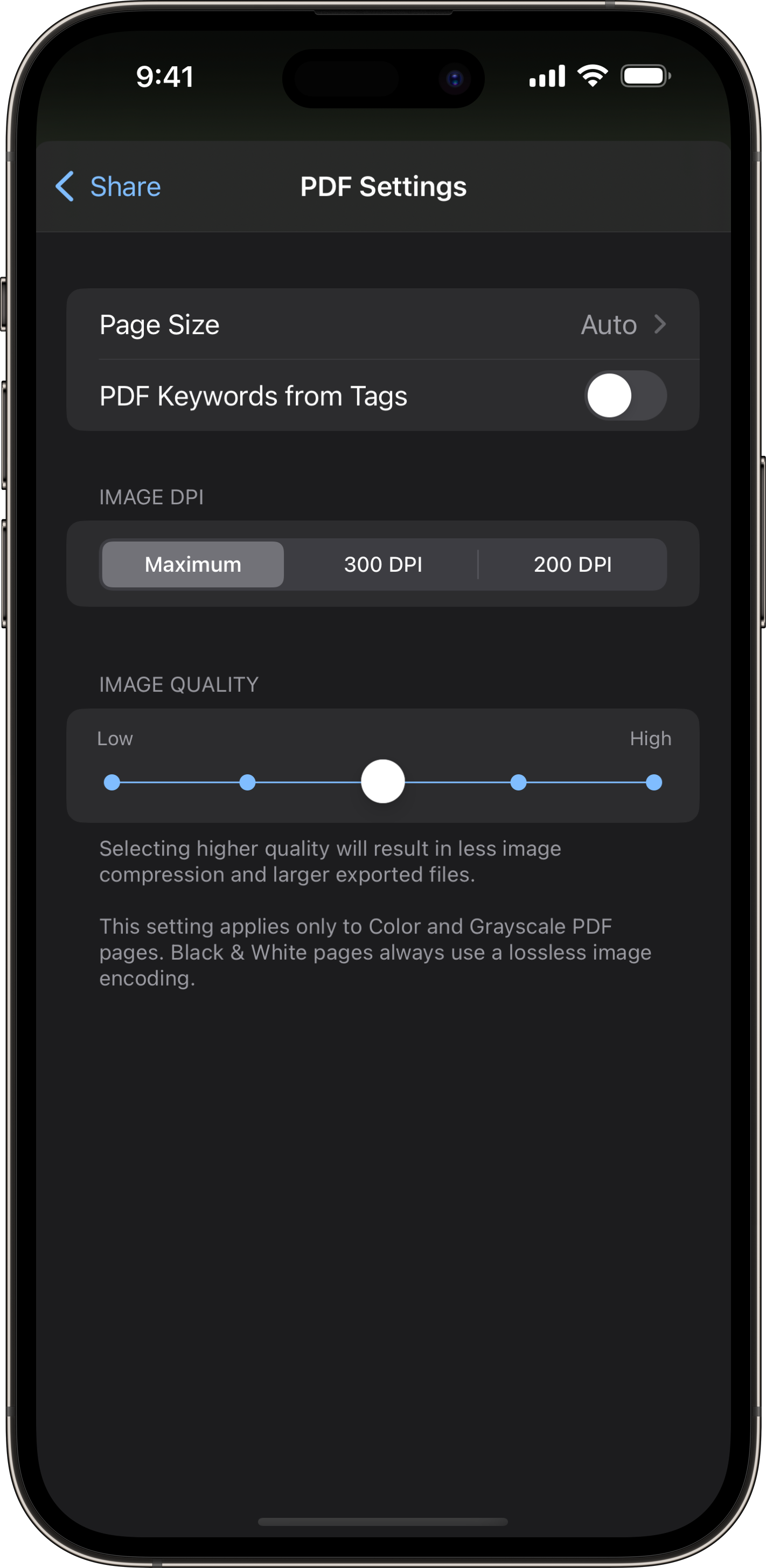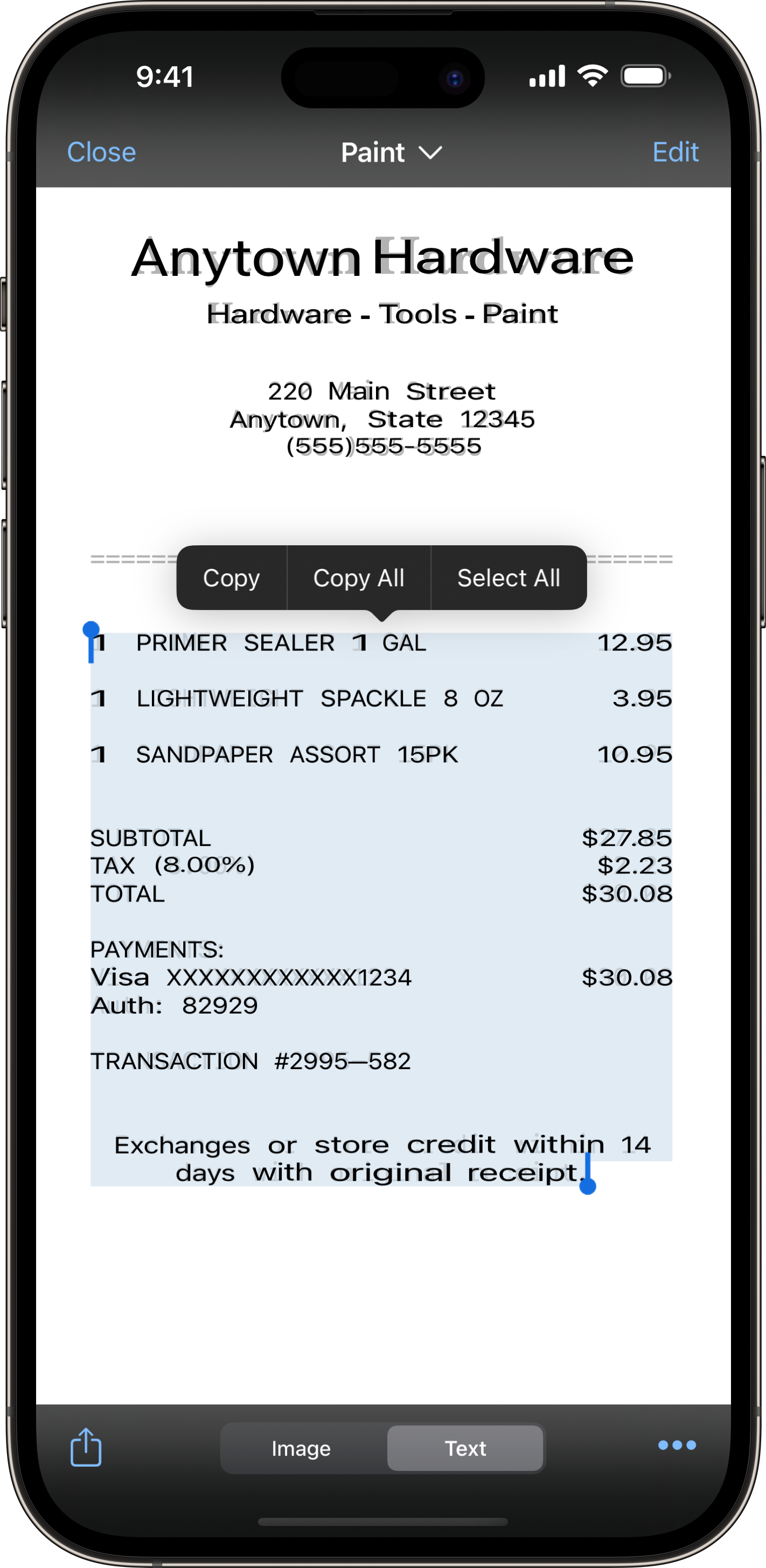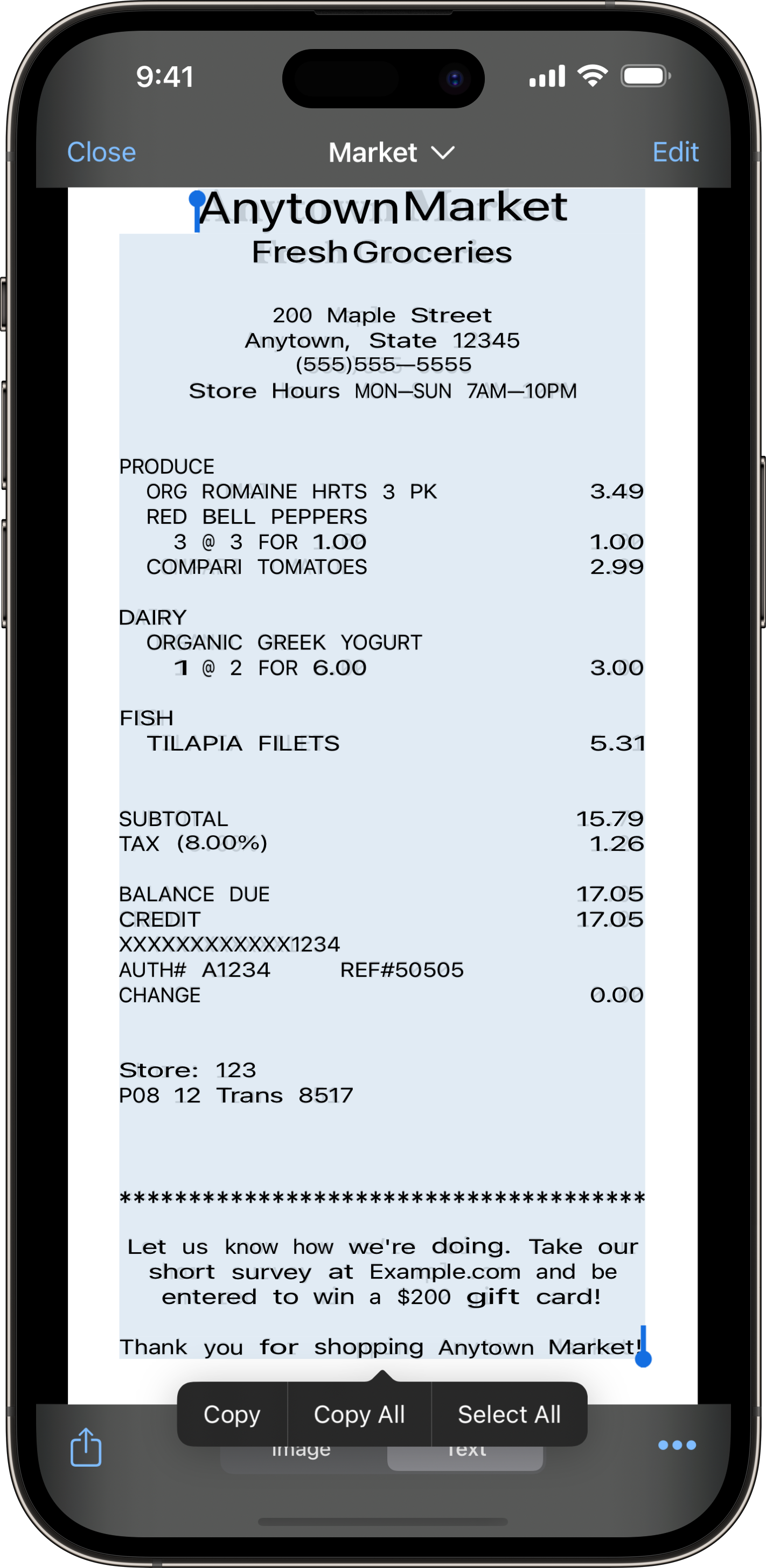 Built-in text recognition (OCR) converts your scanned documents to selectable text. Text recognition is performed directly on your device so your documents remain private and secure.